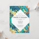 Um padrão vibrante de frondes de ouvido e palma de elefantes em azul, turquesa, laranja, amarelo e branco formam um lindo padrão repetitivo atrás de uma diagonal branca que tem textos pretos para sua redação personalizada para os convidados. Celebre sua festa especial com estes convites exclusivos e altere a cor do plano de fundo para uma de suas escolhas pessoais.