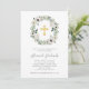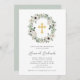 Este simples e elegante convite de comunhão religiosa apresenta uma coroa com lindas flores brancas e de cor cinza suaves, e folhahem verdes de eucalipto, sobre fundo branco. Uma cruz falsa dourada também é apresentada.