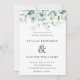 Este convite de casamento quadrado apresenta cor d'água, eucalipto, verde botânico e folhas azuis claras com seus nomes unidos por uma serigrafia verde de eucalipto.