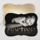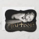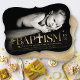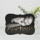 Tipografia moderna e elegante em folha de ouro falso sobre preto com foto de cruz em negrito no cartão de convite religioso para batismo.