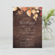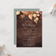 Este cartão de recepção de elopamento de madeira marrom rústica com folhas de outono é perfeito para uma festa pós-elopamento de outubro. O design rústico campestre apresenta folhas de outono pintadas à mão em tons de pôr do sol em amarelo, laranja queimado e vermelho borgonha que se destacam em um fundo de madeira falsa. Os cartões de RSVP são vendidos separadamente.