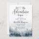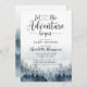 Chá de fraldas de árvores da floresta aquícola com a frase: que a aventura comece a ser tema. Cor verde azul e verde etéreo. Nome na assinatura do script.