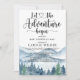 Que a aventura comece o tema chá de fraldas aquática por correio com floresta e montanhas paisagem selvagem com tipografia de escrita de caligrafia com coração no meio. Consulte o conjunto de cheios deste design, com materiais e suprimentos de festas correspondentes em: https://www.zazzle.com/collections/forest_adventure_baby_shower-119311648144421112