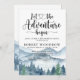 Que a aventura comece o temático convite de festas de aquarelas com floresta e montanhas paisagem selvagem com tipografia de escrita de caligrafia. Um tema de aventura da floresta rústica.