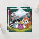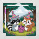 An adorable baby's first birthday invitation with a forest animal theme. A cute raccoon and squirrel holding a blackberry cupcake wearing birthday hats.