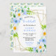 This fun and whimsical birthday party invitation features watercolor blue forget me nots, daisies and foliage on a gold geometric frame. The text combines handwritten script and serif fonts for a stylish and modern look. This is perfect for a spring or summer rustic birthday party.