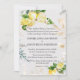 Design de cartão elegante com frutas de limão a cores da água, flor branca, folhas, sobre fundo de champanhe chico com folhas verdes e douradas. No verso, quase o mesmo design e iniciais. Use a ferramenta Personalizar para adicionar suas informações. Para obter itens correspondentes, visite minha Coleção de Estilos Mediterrânicos.