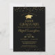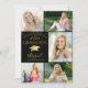 Convite de festa de formatura elegante preto e dourado (ou outra cor de fundo) com uma colagem fotográfica de 5 fotos na frente (e 1 no verso), um falso boné de formatura metálico de folha de ouro ou placa-mãe, minúscula confetti de estrela dourada, um elegante FORMANDO de tipografia caligráfica 20XX e um roteiro moderno manuscrito para o seu nome de formando. A cor de fundo preto editável pode ser alterada para uma cor de escola, cor favorita ou uma cor que coordene suas fotos. ASSISTÊNCIA: para obter ajuda com a modificação ou personalização do design, alteração de cor, transferência do design para outro produto ou você gostaria de coordenar itens, entre em contato com o designer ANTES DE ENCOMENDAR através da guia MENSAGEM de bate-papo Zazzle ou envie um email para makeitaboutyoustore@gmail.com.