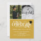 Convite para formatura de fotos com formando em uma fonte elegante com um pequeno boné de formatura na a. Convite para a graduação em tipografia moderna personalizado com três fotos, uma grande de um lado e duas menores do outro. Anúncio de dupla graduação e de graduação impresso com uma grande foto do formando de um lado e o convite em branco e amarelo mostarda do outro lado.