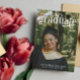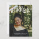 Convite para formatura de fotos com formando em uma fonte elegante com um pequeno boné de formatura na a. Convite para a graduação em tipografia moderna personalizado com três fotos, uma grande de um lado e duas menores do outro. Anúncio de formatura dupla e graduação impresso com uma grande foto do formando.