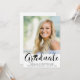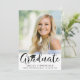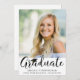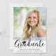 Convide os convidados para a festa de formatura do seu formando com este convite fotográfico com uma fotografia e um FORMANDO de título de script de caligrafia elegante, acentuado por um boné de formatura a preto em branco, com detalhes da festa no verso. ASSISTÊNCIA: para obter ajuda com a modificação ou personalização do design, transferir o design para outro produto ou, se você quiser coordenar itens, entre em contato com o designer ANTES DE ENCOMENDAR através da guia MENSAGEM de Bate-papo Zazzle ou envie um email para makeitaboutyoustore@gmail.com.