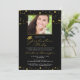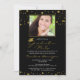 O convite para festa de formatura elegante preto e dourado com a foto do seu formando, o confete dourado com a letra de um roteiro manuscrito acentuado com um boné de formatura ou placa-mãe com brilho dourado contra um fundo preto editável que você pode mudar para uma cor da escola, uma cor para coordenar com sua foto ou uma cor favorita. As costas apresentam brilho dourado para a garota que ama um pouco de brilho. ASSISTÊNCIA: para obter ajuda com a modificação ou personalização do design, alteração de cor, transferência do design para outro produto ou você gostaria de coordenar itens, entre em contato com o designer ANTES DE ENCOMENDAR através da guia MENSAGEM de bate-papo Zazzle ou envie um email para makeitaboutyoustore@gmail.com.