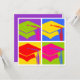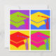 Convite da graduação do pop art que caracteriza quatro bonés de formatura com as borlas em cores brilhantes. Aperfeiçoe para formandos do jardim de infância, do segundo grau ou da faculdade. Original de PinkInkArt!