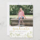 Convite à festa de formatura botânica com 4 fotografias (1 na frente e 3 no verso), folhas de aquarela e FORMANDO de título numa folha de ouro falso, tipografia manuscrita, com letra de mão, nome e ano de aula na frente. O verso apresenta três fotos e um padrão de folha de coordenação e um bloco verde de cor aquosa macia com os detalhes da festa de formatura. ASSISTÊNCIA: para obter ajuda com a modificação/personalização do design, alteração de cor, transferência do design para outro produto ou, se você quiser coordenar itens, entre em contato com o designer ANTES DE ENCOMENDAR através da guia MENSAGEM de bate-papo Zazzle ou por e-mail em makeitaboutyoustore@gmail.com.