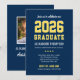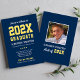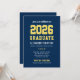 Anuncie seu formando da turma de 2023 com estilo com este anúncio de formatura e convite de festa. Cartão frente e verso apresenta um design simples e masculino com letras inspiradas em camisas de esportes, perfeito para seu aluno estrela e atleta da equipe. Cores azul marinho, amarelo e branco. Espaço para incluir uma foto do formando no verso. Todas as cores podem ser personalizadas.