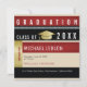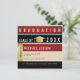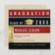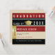 Listras pretas e vermelhas com a imagem de um chapéu de ouro falso e informações personalizadas de festa de formatura... um na moda e um design rsvp moderno