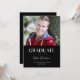 Este cartão com fotos de graduação moderno apresenta uma simples tipografia e uma grande foto. Uma foto horizontal do formando está no topo, com a palavra "Formando" escrita em letra maiúscula de tendência abaixo. Por baixo da tipografia, adicione o nome do formando na caligrafia, com a escola e o ano de graduação no fundo do cartão. A tipografia é branca contra fundo preto. A parte traseira da placa de graduação inclui um modelo opcional para adicionar detalhes da festa de formatura.