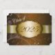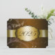 Convite à graduação castanho e dourado com floral castanho claro e escuro e uma fita de ouro passando mostrando o ano de graduação. A parte traseira do cartão é marrom com fonte de ouro claro para as pessoas preencherem os anúncios de graduação.