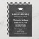 O convite de festas "CHURRASCO de quintal" apresenta um motivo de boné de formatura, texto personalizado na moda em fontes ocidentais e modernas, um design de rolagem e faixa e um giz branco manuscrito sobre um fundo com uma aparência rústica de quadro negro. Perfeito para uma festa de formatura casual de verão ao ar livre.