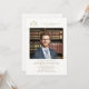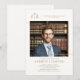 Celebre seu formando na Faculdade de Direito - ou você mesmo - com este elegante e clássico convite de fotos da graduação na Faculdade de Direito com um tema branco e ouro. Substitua as escalas de justiça pelo logotipo da sua escola ou deixe-a como está. A design de tipografia contemporânea é elevada pelas matizes douradas e pela disposição minimalista. Duas linhas de ouro (efeito digital!) sugerem um quadro moderno e minimalista para a foto. Personalize cada linha de texto. Marinho e ouro falso.