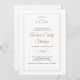 Um convite à festa de formatura de quadros triplos e falsa para um formando de direito que é simples, mas sofisticado, eterno e elegante. Observe que o relevo nos quadros é criado por meio de uma imagem e nenhum relevo real aparecerá na placa. No topo, uma ilustração estilizada do vetor das escalas da justiça mostra o ano da graduação. Um falso efeito do ouro nas escalas da justiça e na cor da caligrafia eleva esse clássico e elegante convite à festa de formatura. Personalize cada linha de texto. Preto, branco e ouro.