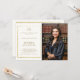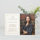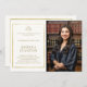 Celebre seu formando na Faculdade de Direito - ou você mesmo - com este elegante e clássico convite de fotos da graduação na Faculdade de Direito com um tema de marfim branco e ouro. Substitua as escalas de justiça pelo logotipo da sua escola ou deixe-a como está. A design de tipografia contemporânea é elevada pelas matizes douradas e pela disposição minimalista. Um quadro de ouro esfregado decora a área de tipografia. Personalize cada linha de texto. Branca de marfim e ouro falso.
