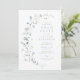 Flores silvestres de cor aquática delicadas e elegantes, ao lado de seus detalhes de eventos. Paletas de pastel de amarelo macio, branco esbranquiçado, verde-sábio, azul empoeirado e verde botânico.