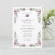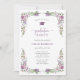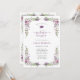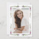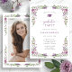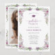Convite de Formatura com Floral Roxo. Celebre sua conquista com estilo com este elegante convite de festa de formatura, perfeito para formandos do ensino médio e graduados universitários. Com uma moldura retangular lindamente desenhada, este convite é adornado com exquisitos florais pintados à mão em aquarela em lavanda suave, rosa beije, burgundy profundo e roxo vibrante. Flores silvestres delicadas, rosas e folhagens elegantes adicionam um toque refinado, enquanto um capuz de formatura roxo fofo traz um elemento lúdico, mas sofisticado ao design. A caligrafia elegante aprimora a aparência atemporal, tornando-a perfeita para celebrações de primavera e verão. O verso apresenta um padrão coordenado junto com espaço para uma única foto querida, permitindo que você personalize seu convite e o torne um anúncio digno de ser guardado como lembrança do