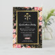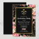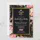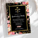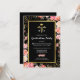Convites de festa de formatura de enfermagem elegantes com fundo preto moderno, flores cor-de-rosa em aquarela fofas, brilho cintilante dourado, símbolo médico caduceu e um modelo de festa de formatura que é fácil de personalizar.