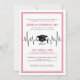 Este convite de formatura elegante e moderno apresenta uma mistura sofisticada de fontes clássicas serifadas e tipografia moderna e limpa, combinando preto e vermelho para um visual atemporal e contemporâneo. O design exibe uma linha de batimentos cardíacos de EKG com um chapéu de formatura no centro, mostrando "Turma de 2026" no topo e o ano de formatura abaixo. Uma moldura fina de linha dupla com acentos vermelhos adiciona um toque refinado, tornando-o perfeito para celebrar um graduado de medicina ou enfermagem.