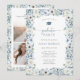 Convite de Formatura Floral Azul. Convide amigos e familiares para celebrar sua conquista com este convite de festa de formatura encantador e sofisticado, projetado tanto para formandos do ensino médio quanto para graduados universitários. Este design exala elegância rústica, apresentando uma moldura retangular de aquarela pintada à mão, adornada com rosas em azul empoeirado, creme e branco, e folhagem verde de eucalipto sage exuberante. Uma boina de formatura azul empoeirada fofa adiciona um toque divertido e comemorativo, enquanto a fonte azul-cinza suave complementa perfeitamente a estética atemporal. O verso do convite apresenta um padrão coordenado junto com um espaço para uma foto especial, tornando-o uma maneira perfeita de destacar este momento marcante. Ideal para celebrações de primavera e verão, este convite reúne estilo clássico e charme pessoal para um evento inesquec