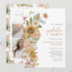 Convite de Formatura de Girassol. Celebre seu marco importante com estilo com este convite de festa de formatura deslumbrante, apresentando um buquê lateral pintado à mão de flores silvestres rosa e azul empoeirado com girassóis amarelos rústicos. A elegante escrita em ouro adiciona um toque refinado, complementando lindamente o design floral. No verso, uma colagem de 3 fotos permite que você exiba suas memórias favoritas, emolduradas por um padrão de aquarela coordenado para uma aparência coesa e polida. Defina o tom perfeito para a celebração de formatura do ensino médio ou faculdade - crie uma lembrança tão única quanto sua jornada!