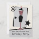 Um convite de festa de aniversário inspirado na moda retrô vintage apresentando uma ilustração de uma forma de vestido rosa e preto na frente. Personalize o texto na frente e atrás com detalhes da sua ocasião.