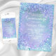 Maravilha de inverno congelada Quinceanera convida com belos flocos de neve roxos e azuis em um bonito fundo azul-d-água. Este elegante convite para Quinceanera azul e roxo é facilmente personalizado para o seu evento simplesmente adicionando os seus detalhes à frente e atrás conforme necessário no estilo de letra, cor e texto da sua escolha. Este é um design impresso sem brilho real, joias, etc.
