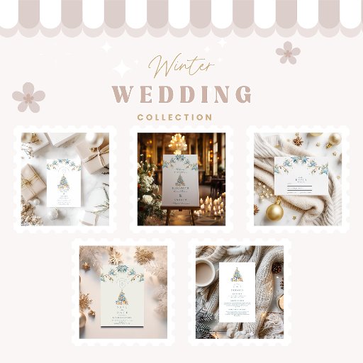 Este delicado design apresenta uma árvore de Natal de cor aquosa, enfeitada com ornamentos azuis e presentes pastéis, enquadrada por galhos de pinheiro ouro e estrelas azuis. Um sonho e romântico assumindo uma estética casamento no inverno — elegante, caprichosa e cheio do charme sazonal.