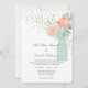 Uma imagem azul esbranquiçada de mason jar, fosco verde, segura laranja pastel e flores de coral com verde mole na frente deste bonito convite para o casamento. Um fundo de confete de ouro flecha para acrescentar interesse e contraste às delicadas flores. Seu texto personalizado está em negros. A parte de trás do convite é um terreno sólido. Um design moderno que seja apropriado para primavera, verão ou outono! *Este design usa trabalho de arte do LABFcreations no Etsy.