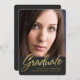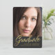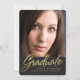 Anúncio cinzento e preto à moda da foto da graduação das riscas com a folha de prova escrita à mão elegante do roteiro da folha de ouro do falso. A festa de formatura opcional convida a parte traseira do texto sobre. Nota: Mostrado no tamanho 5x7 com opção cortada. Clique por favor "personalizam" para mudar o tamanho, a forma ou os estilos de pia batismal.