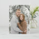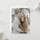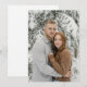 Este convite de casamento apresenta uma cena invernal aconchegante com um casal se abraçando em uma floresta nevada. O design apresenta um estilo fotográfico naturalista, capturando a calidez e a intimidade do momento contra um pano de fundo de árvores sempre verdes cobertas de neve. A paleta de cores é dominada por brancos e cinzas frios, complementada por tons terrosos das roupas dos sujeitos, criando um clima sereno e afetuoso. Perfeito para casais que amam a beleza da natureza e a tranquilidade do inverno, este convite define o tom para uma celebração sincera.