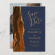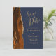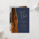 Este elegante e moderno salve a placa de data apresenta uma cor d'água laranja queimada e borda geode aparada com falso brilho dourado. O texto dourado aparece sobre um fundo azul marinho. Substitua facilmente a imagem de exemplo no verso por sua foto vertical favorita.