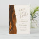 Este elegante e moderno salve a placa de data apresenta uma cor d'água laranja queimada e borda geode aparada com falso brilho dourado. O texto dourado aparece num fundo de marfim. Substitua facilmente a imagem de amostra no lado oposto por uma foto vertical da futura noiva e noiva.