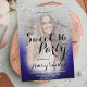 Um moderno, bonito e falho chá brilhante prateado com bloco royal de cor azul, convite de aniversário Sweet 16 com sua foto personalizada com padrão de massa prateada desaparecendo em um fundo preto de cinza. Perfeito para uma princesa Doce 16.
