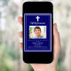 Um fundo azul marinho, decorado com uma estrutura branca, e uma cruz branca Personalize e adicione um nome de foto e detalhes. Texto branco.