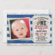 Convide seus hóspedes em estilo com este convite de festas de primeiro aniversario de fotos de jogos de futebol super giro. este design apresenta um fundo rústico de madeira azul e branca, à esquerda está a foto do seu bebê em um quadro (o quadrado funciona melhor) e à direita está um bilhete com todas as suas informações pessoais. Diz: "O nosso pequeno quarterback está a tornar-se um, por favor, junte-se a nós para este Episódio de Aniversário épico, em honra do nome do seu filho, data da festa e endereço com o RSVP abaixo. A parte de trás do cartão tem listras azuis e brancas em madeira de penas correspondentes. Este é um convite personalizado especial que sua família e amigos adorarão e guardarão como lembrança. Desenhado pela artista ©Susan Coffey e Tim Coffey. Fotografia © Storytree Studios, Stanford, CA.