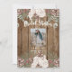 Cerca de madeira. Chá de panela Floral Branco e Pine Cone. Fundo creme. Informações no verso. Foto de noiva.