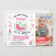 Foto rosa-branca Num primeiro aniversario de Melão Convite A Melão de Menina-Feira-Feira, o primeiro convite de aniversário, com algumas fatias de melancia, corações, marcas de abertura e uma borboleta rosa minúscula. Este em um convite de aniversário de melão também mostra uma foto na frente.