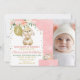 Foto Dourada e cor-de-rosa Floral Fluffy Bunny Convite para primeiro aniversario Coelho Bonito e Balão de Ouro Falso Primeiro Convite de Aniversário para uma menina com um coelho fluffy castanho, na sua maioria arranjos florais cor-de-rosa e um balão de ouro falso e pontos. A foto da sua menina aparece no lado direito. Excelente para o coelho de uma garota, a primeira festa de aniversário.