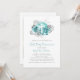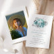 Este elegante primeiro convite da comunhão apresenta uma cruz branca sobre um fundo de flores aqua e é disparado por delicadas folhas de falso prateado e folhagem brilhante. O texto personalizável combina o script de escrita manual do aqua e a fonte da placa da cinza do carvão em um fundo branco. Substitua facilmente a imagem de exemplo no verso por uma foto vertical do convidado de honra.
