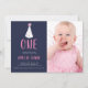 Um primeiro convite de aniversário moderno para sua garotinha em marinho, rosa, com um chapéu de pompom de aquarela, fonte escrita com letra de pincel e padrão de risca diagonal no sentido inverso, e uma foto da sua pequenina.
