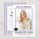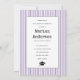 Classe de 2023 — convite para fotografia de graduação de listas roxas de máquinas de escrever. O dorso inclui um padrão roxo e branco com listras.