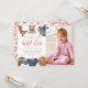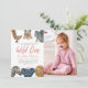 Primeira convite de aniversário de uma criança bonita e divertida com uma foto que mostra a ilustração de animais safari de girafa, leopardo-da-neve, rinoceronte, leão, elefante e zebra com flores, coroas e chapéus de festa cor-de-rosa. O texto diz "Wild One". Perfeito para a festa de primeiro aniversario de uma menina.
